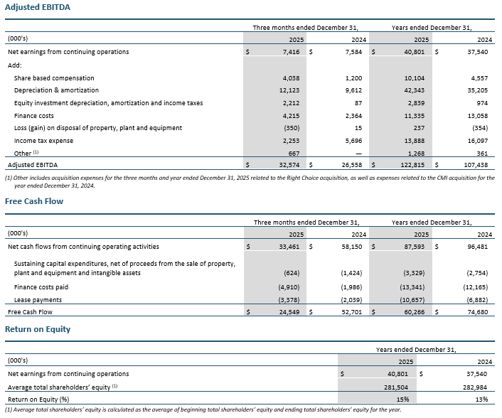 - Adjusted EBITDA for 2025 was $122.8 million, an increase of 14.3% compared to 2024 as a result of strong workforce accommodation occupancy and contributions of $2.8 million and $7.2 million from the investments in Pleasant Valley Corporation (“PVC”) and Right Choice, respectively. Adjusted EBITDA for Q4 2025 was $32.6 million, an increase of 22% compared to Q4 2024 driven primarily by the factors mentioned above and contributions from PVC and Right Choice.